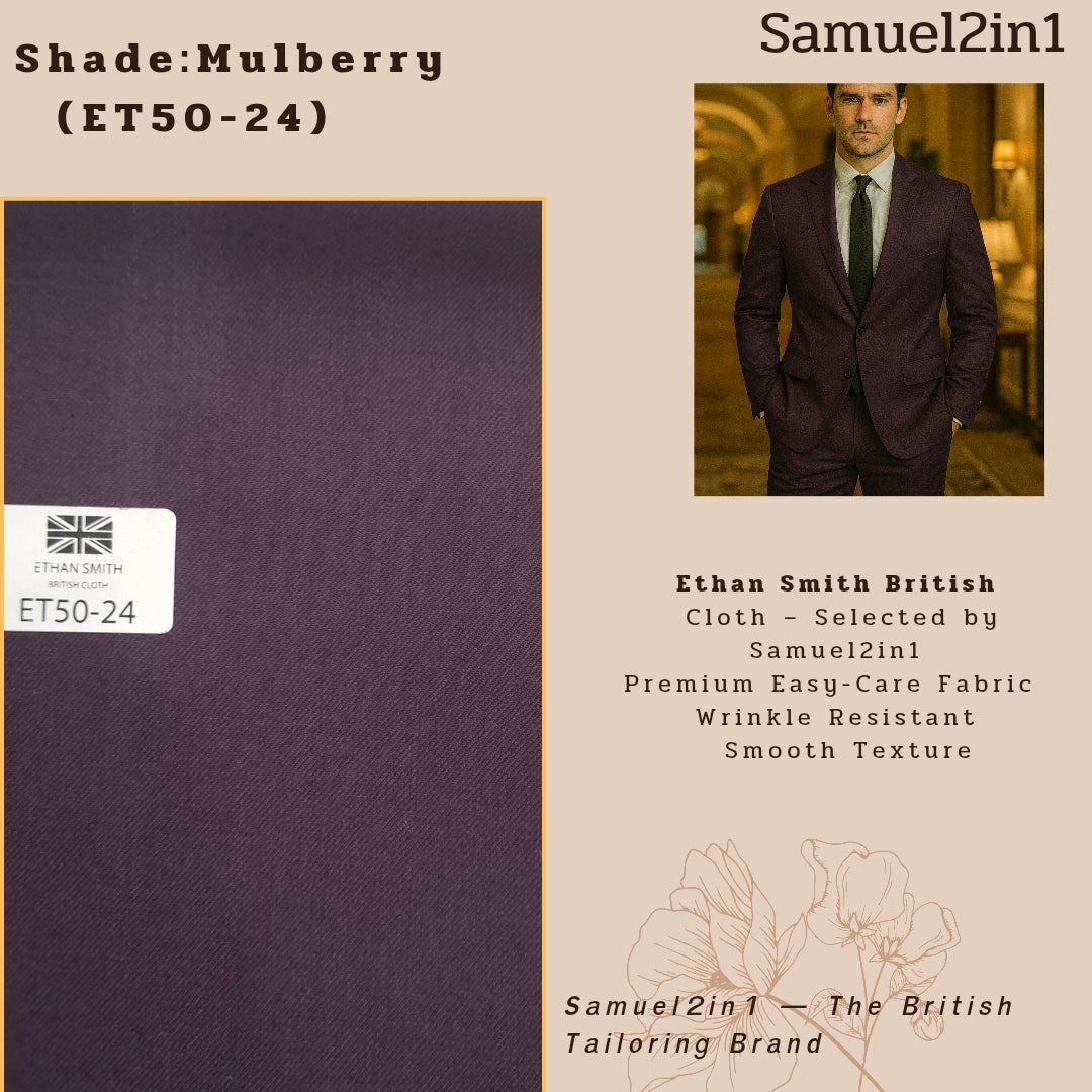Experience the timeless sophistication of Mulberry (ET50-24) – a luxurious deep plum fabric chosen by Samuel2in1. Perfect for bespoke British tailoring, this cloth delivers a polished finish and long-lasting wear.