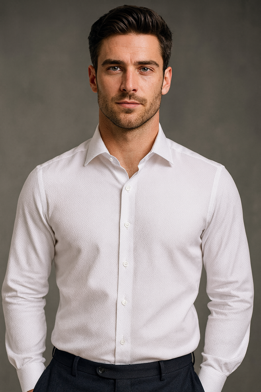 Crafted from high-quality wrinkle-resistant cotton, this fabric ensures lasting comfort, smooth texture, and refined appearance — perfect for both business and casual shirts.