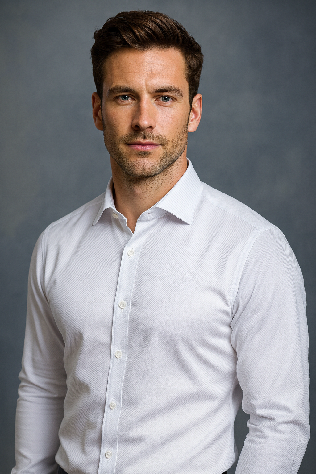 Elegant white twill shirting fabric with a soft diagonal weave, providing texture and durability. Perfect for premium dress shirts, school uniforms, and professional wear.